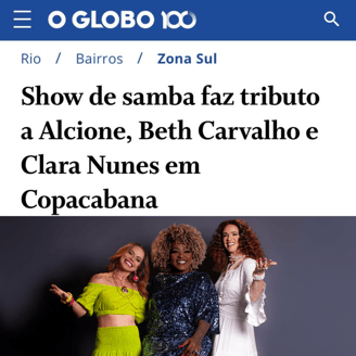 Um espetáculo emocionante que celebra o legado de Alcione, Beth Carvalho e Clara Nunes. No palco, Keilla Regina, Lu Carvalho e Branka encantam com a força e a doçura do samba feminino, sob a direção musical de Carlinhos Sete Cordas.